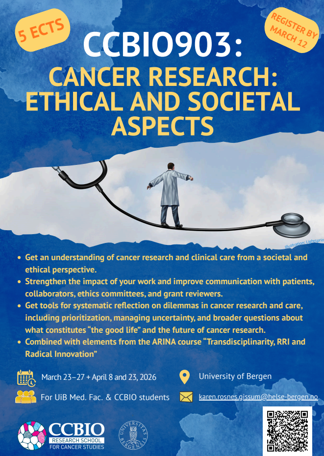CCBIO inviterer til årets utgave av kurset CCBIO903 – Cancer research: Ethical, economic and social aspects, som setter søkelys på etiske og samfunnsmessige problemstillinger i kreftforskning. Målet er å gi PhD-kandidater verktøy for systematisk refleksjon rundt egen og andres forskning, og styrke kommunikasjonen med pasienter, samarbeidspartnere, etikkkomiteer og søknadsvurderere.